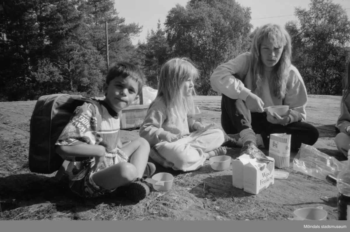 Robin, Jessika och förskollärare Kajsa Lindgren är ute på utflykt. De kommer från Lunkentussen vid Katrinebergs daghem, 1992-93.
