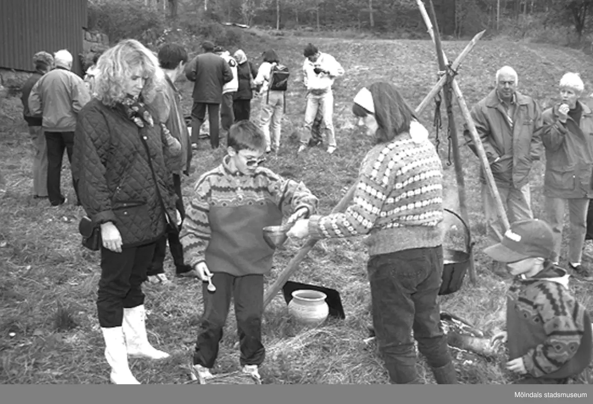 Familjesöndag vid Börjesgården, 1994-05-15. Museichef Mari-Louise Olsson lämnar en skål till en pojke och hans mor.