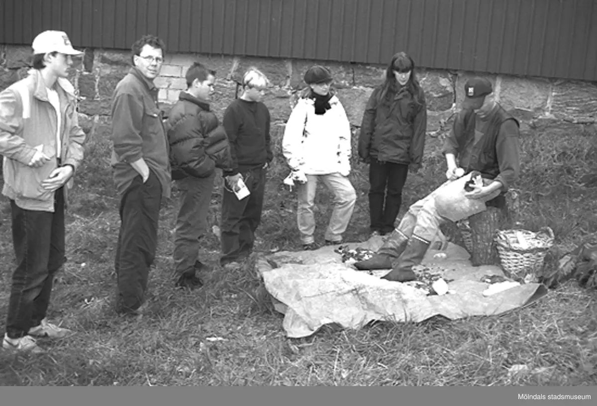 Familjesöndag vid Börjesgården, 1994-05-15. Sex besökare ser på när en man hantverkar med trä.