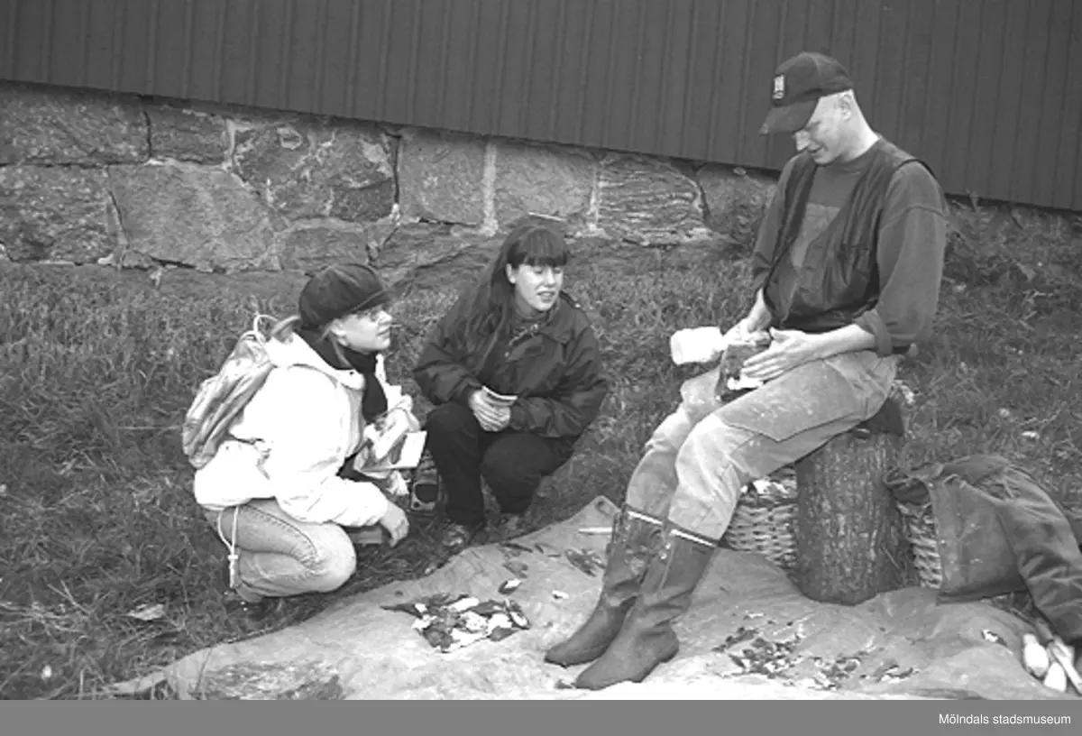 Familjesöndag vid Börjesgården, 1994-05-15. Två kvinnor ser på när en man visar hantverk.