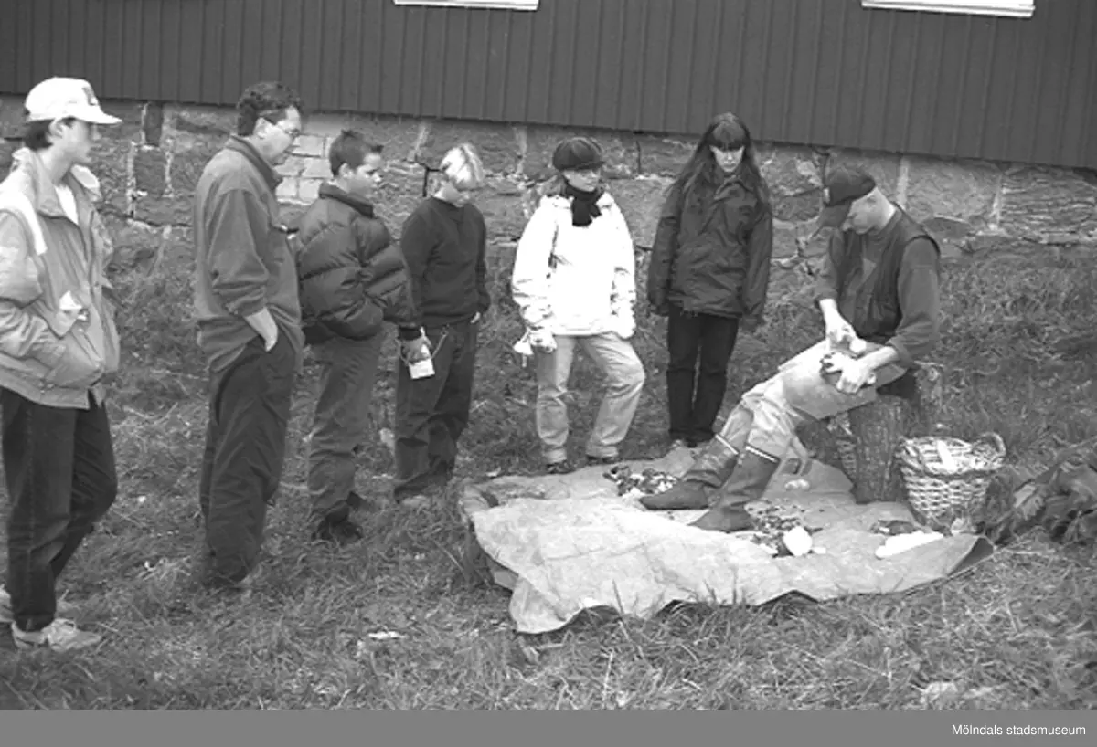 Familjesöndag vid Börjesgården, 1994-05-15. Sex besökare ser på när en man hantverkar med trä.