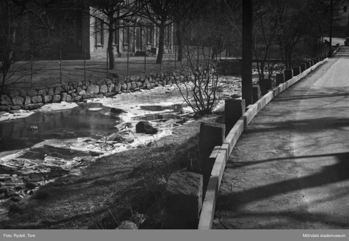 Grevedämmet skola och Mölndalsån sedda från Pixbovägen i Mölndal på 1960-talet.