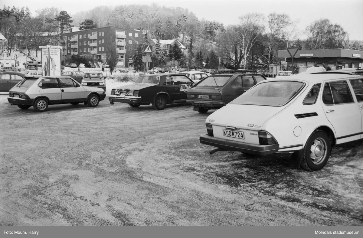 Parkeringsplats i Kållereds centrum, år 1984. I bakgrunden ses bebyggelse vid Streteredsvägen.