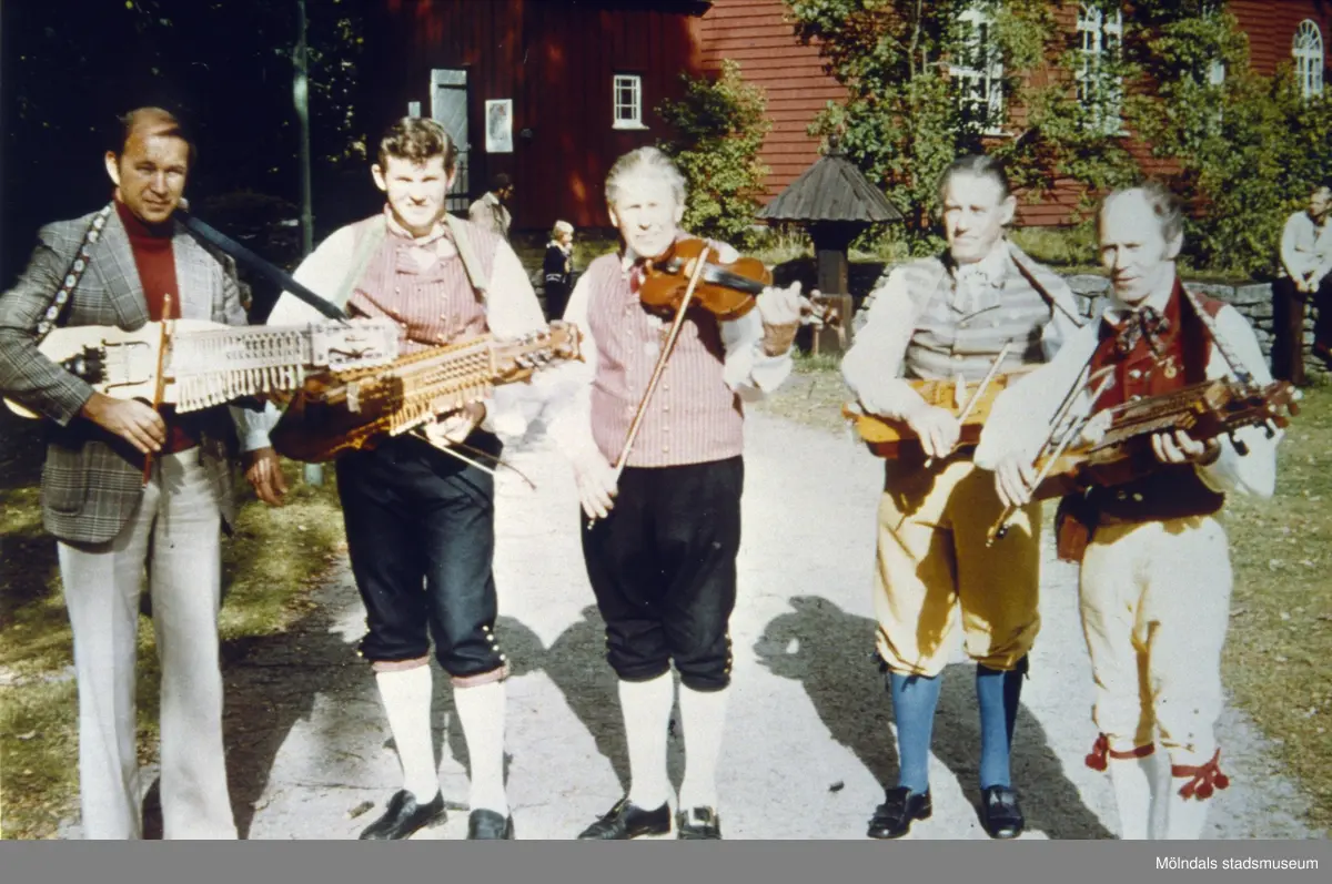 Spelmansstämma i Ramnaparken, Borås 1977.Fem spelemän med nyckelharpa och fioler.