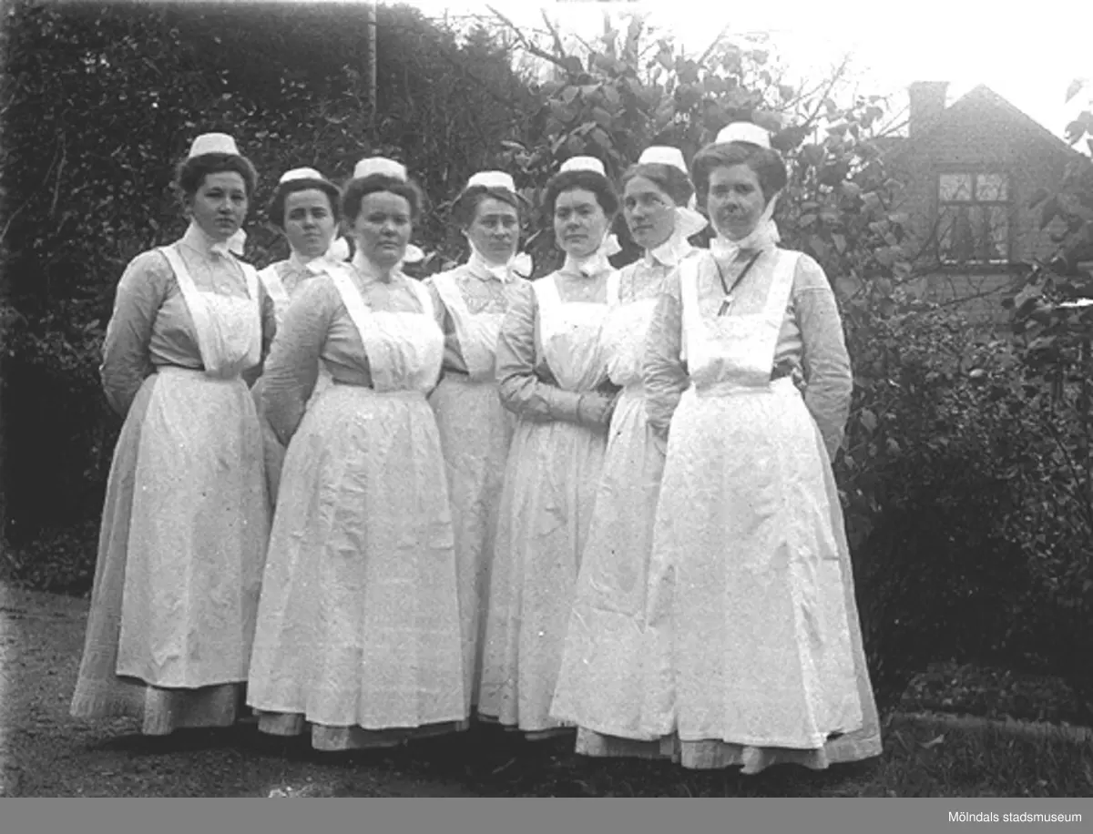 Sju elever vid elevkursens slut, sommaren 1909 utanför Mölndals sjukstuga.