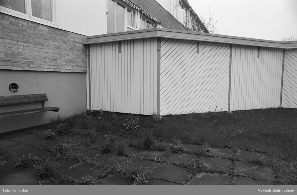 Dokumentation av Sagåsens flyktingförläggning 1992. Exteriör vy mot insynsskydd, bänk, gräsmatta och byggnad.