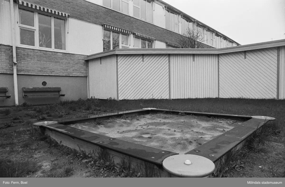 Dokumentation av Sagåsens flyktingförläggning 1992. Exteriör vy på sandlåda, insynsskydd samt byggnad.