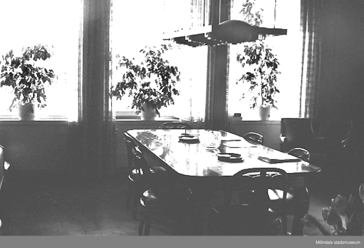 Mölndals stadshus, mars 1988. Interiör: Ett avlångt bord och stolar. I fönstrena står krukväxter.