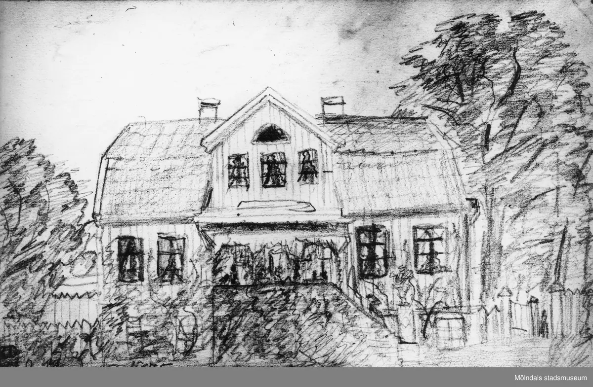 "Lagklarebäck 1895." Den gamla mangårdsbyggnaden Lackarebäcks gård (bostaden med frontespis) från väster eller från trädgårdssidan. Huset brann 1895. Foto av en osignerad teckning.