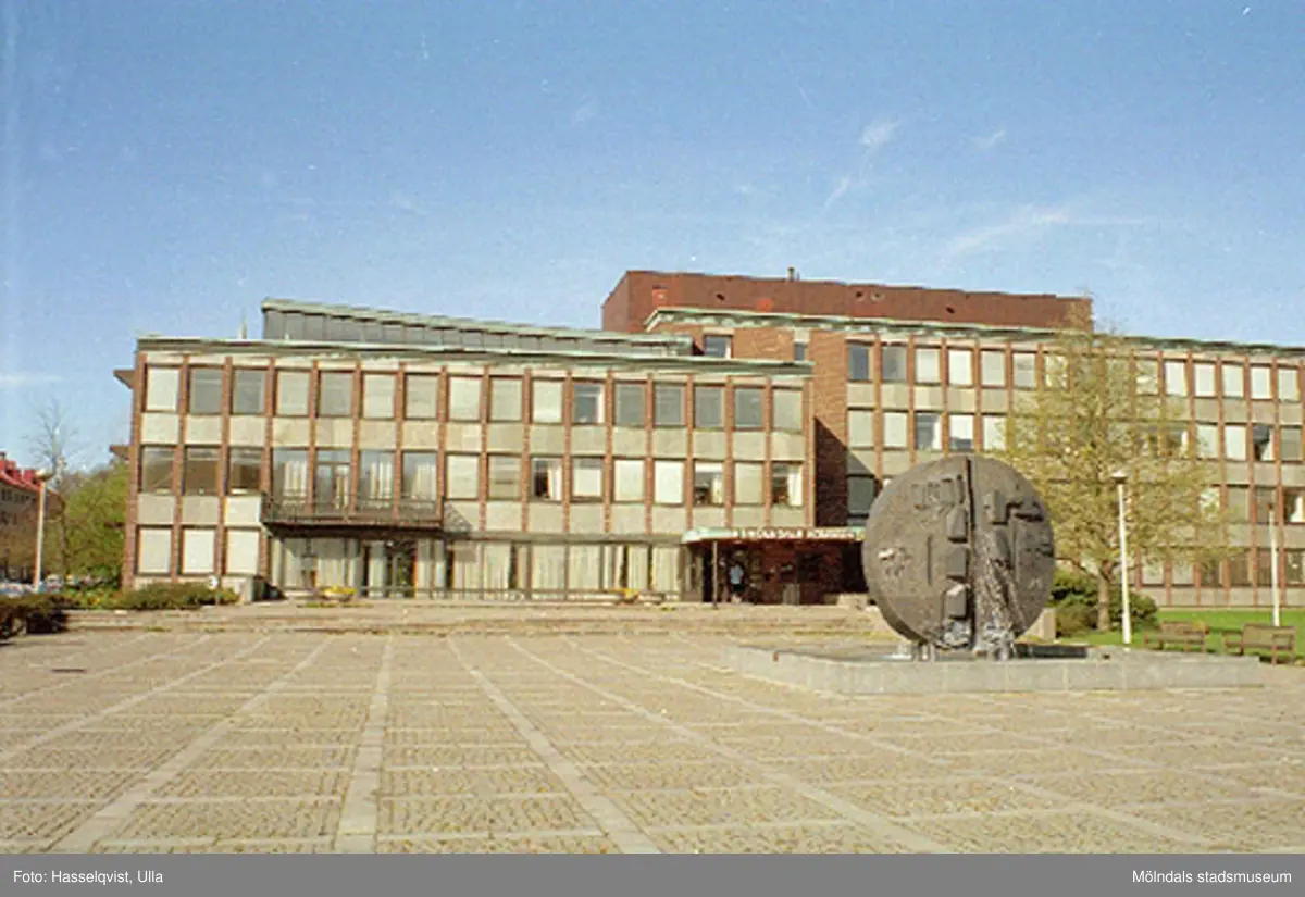 Mölndals stadshus och Stadshusplatsen, augusti 1994, med konstverket Faesbiaergha av Roland Andersson till höger.