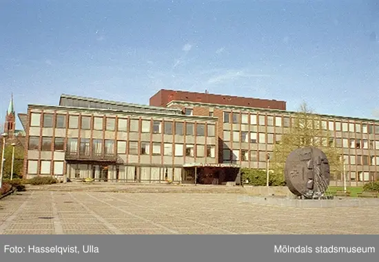 Mölndals stadshus och Stadshusplatsen, augusti 1994, med konstverket Faesbiaergha av Roland Andersson till höger.