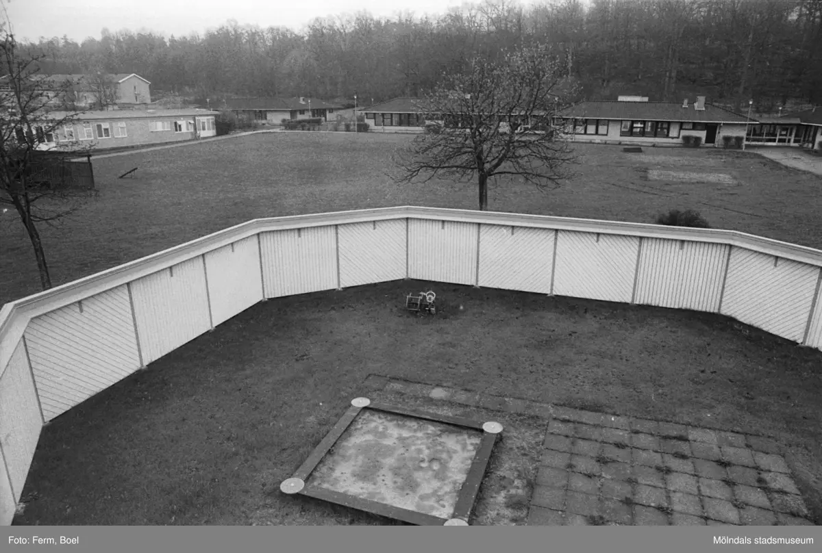Dokumentation av Sagåsens flyktingförläggning 1992. En inhägnad utomhus-lekplats med sandlåda. Utsikt mot byggnader i bakgrunden.