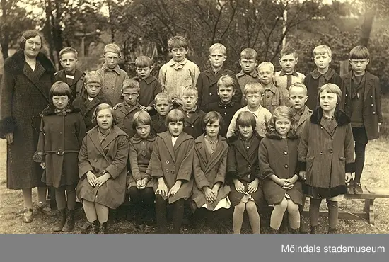Skolfröken fröken Lundgren med skolklass från Grevedämmets skola, år 1926.