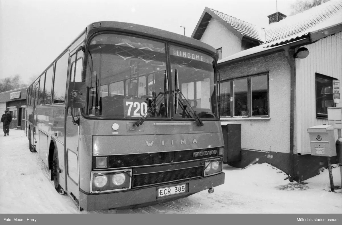 En Kålleredsbuss står parkerad utanför Kålleredsbussarnas kontor i Kållereds centrum år 1985. På marken ligger snö. Kontoret var Vommedal Västergård 3:9 "Tuftet".