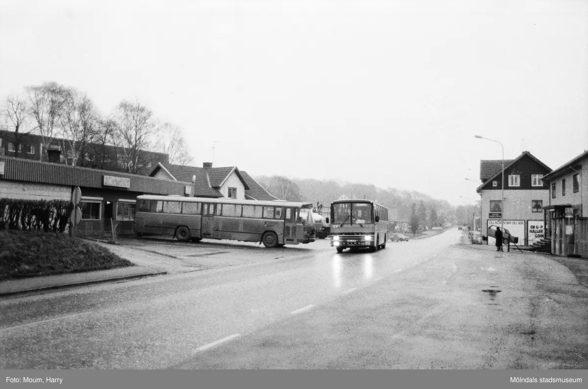 Gamla Riksvägen i Kållered i riktning söderut år 1983. Till vänster ses Kålleredsbussarnas garage och kontorsbyggnad.