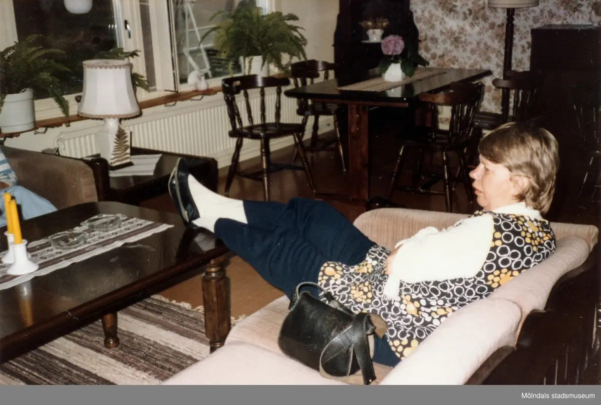 Maj Jernberg sitter i soffan med fötterna på bordet. Gruppboende på Tulegården i Stretered, Kållered. Maj bodde på Streteredshemmet troligen från 1970-1980-talet fram till början av 1990-talet.