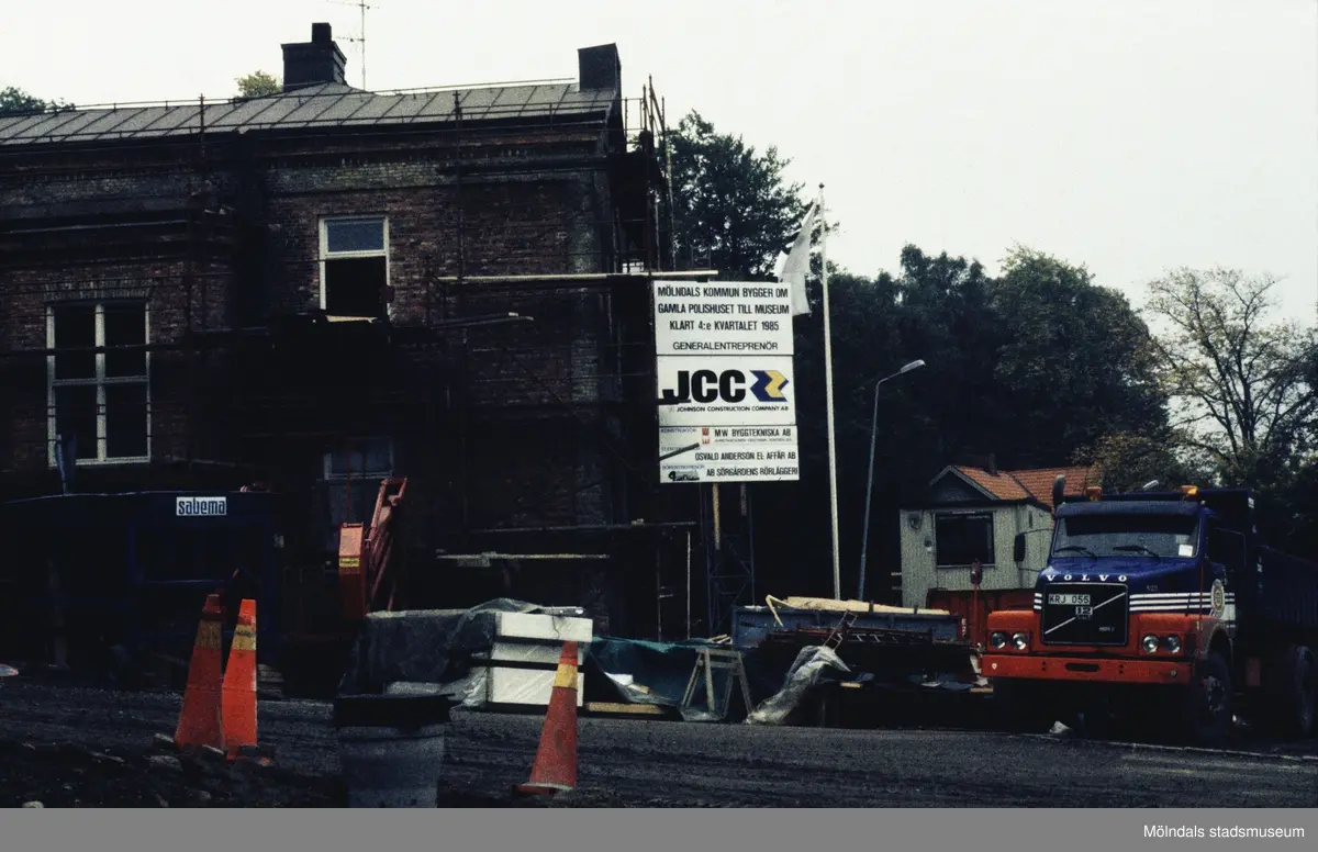 Exteriörfoto från upprustningen av Norra Forsåkersgatan 19 (Kallkällan 1), Mölndals Museums dåvarande lokaler, år 1985.