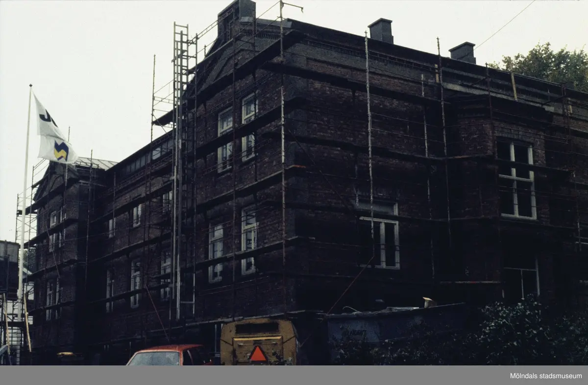 Exteriörfoto från upprustningen av Norra Forsåkersgatan 19 (Kallkällan 1) år 1985. Mölndals Museum hyrde lokalerna vid denna tidpunkt.
