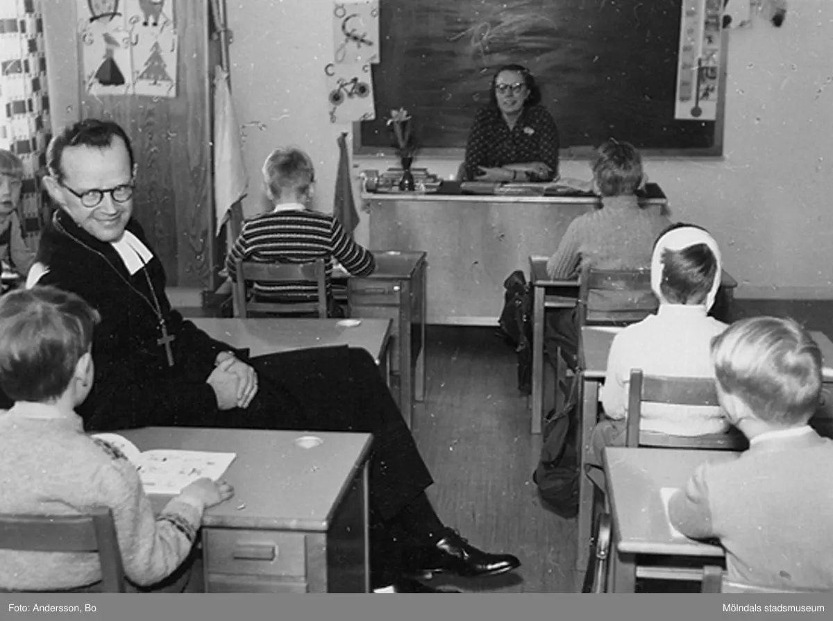 Biskop Bo Giertz besöker Brattåsskolan och sitter bland eleverna i ett klassrum 14 feb 1955. Vid katedern sitter Lärarinnan Greta Andersson (född Alm).
