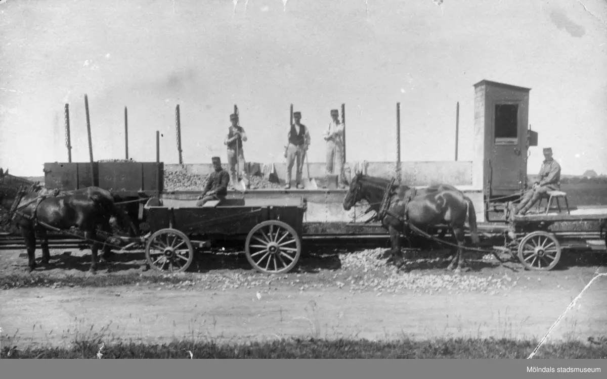 Män, hästar och vagnar på banvallen i Lindome, 1920-tal. Den första järnvägen gick väster om Sagsjön. När man anlade banvallen sjönk väldigt mycket makadam ner i sjön. Ett tåg stod på banvallen när denna började glida, men tåget gick aldrig ner i sjön utan kunde tuffa förbi. Banvallen var alltså på glid, men några tåg har aldrig försvunnit i vattnet. Efter det lades järnvägen över Sagsjön istället. Man bröt sten i Kållered där Makadambolaget nu ligger. På så sätt kom Makadambolaget till.