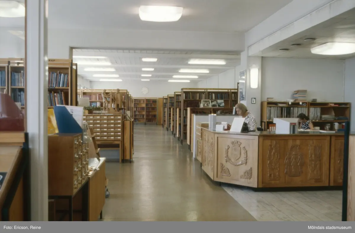 Här är en bild från Stadsbiblioteket. Till höger syns utlånings- eller expeditionsdisken med Mölndals kommunvapen snidat i trä.