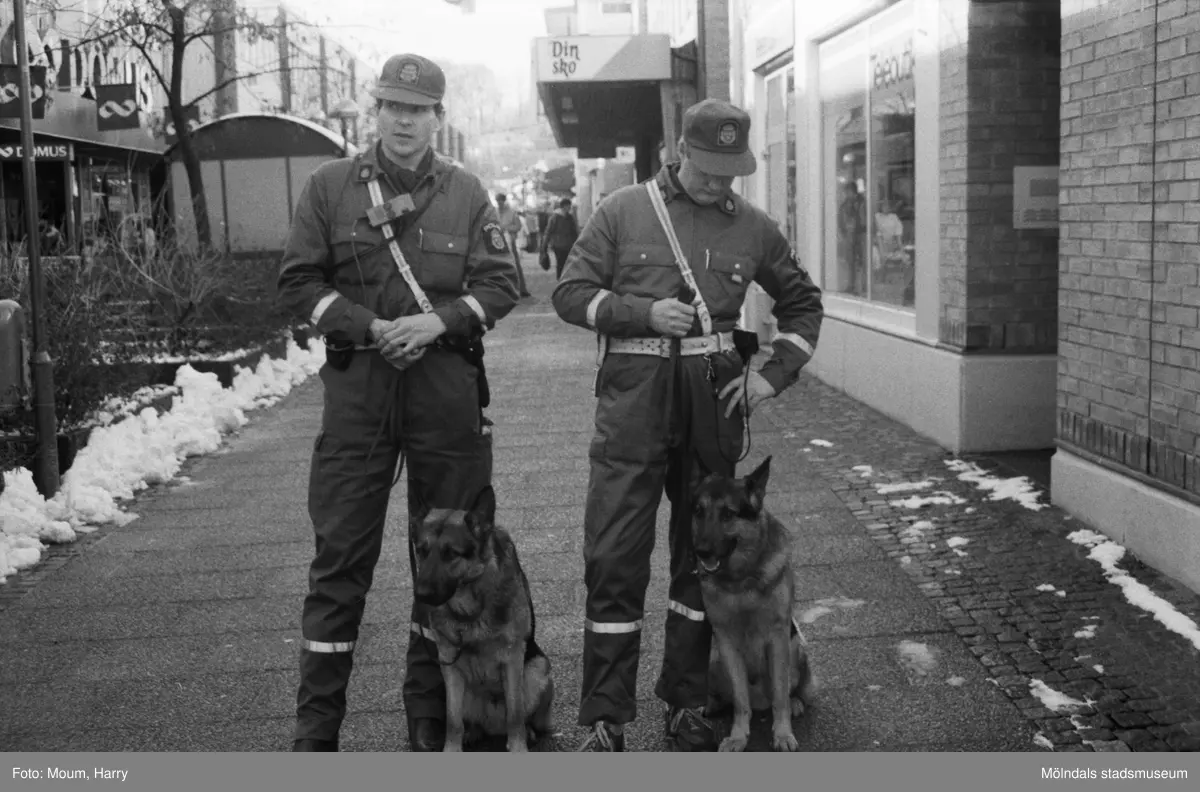 Poliser med hundar i Mölndals köpcentrum, år 1985. "Moltas med sin husse Harry Nilsson och Accent med Ingvar Lauri på promenad."
