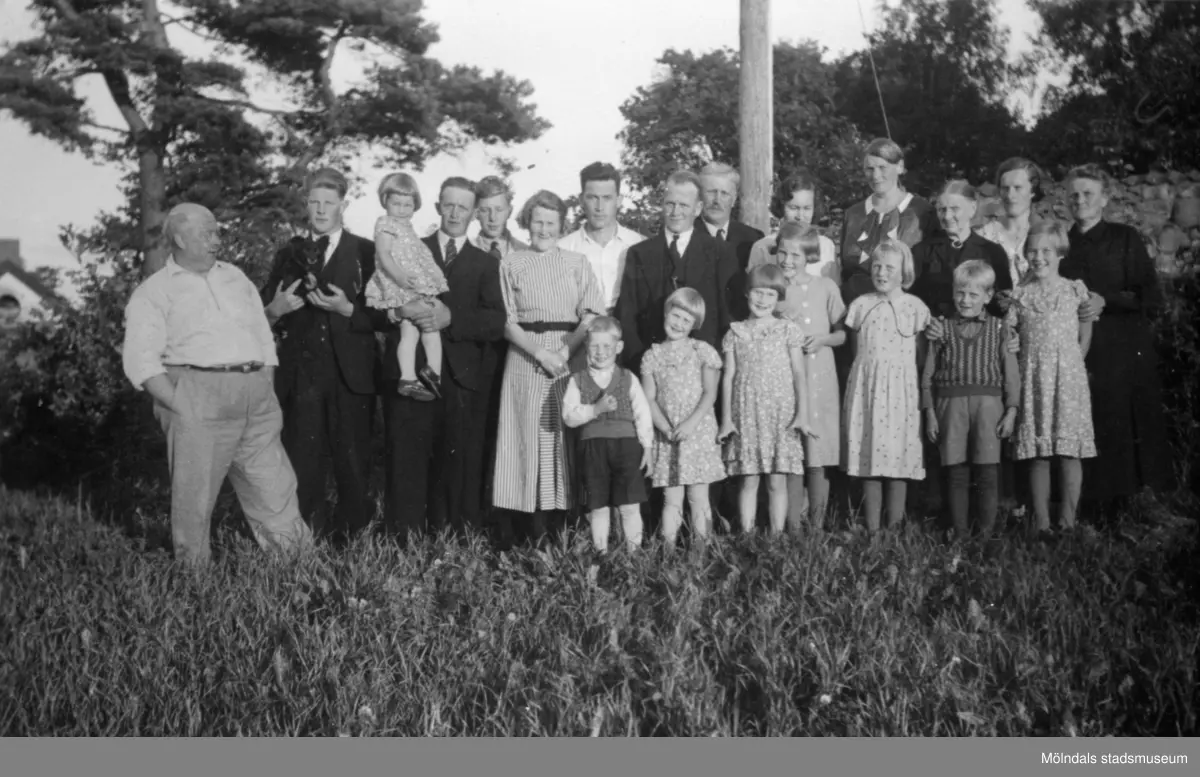 Anton och Klara Svensson med deras barn: Gustav, Erik, Ivar, Elin, Arvid, troligen Hildur, troligen Karin, John och faster Helga tillsammans med alla barnbarnen, cirka 1930- till 40-talet.