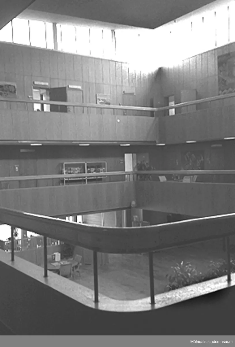Stadshushallen med utsikt över alla våningar och gångar i Mölndals stadshus, juni 1994.