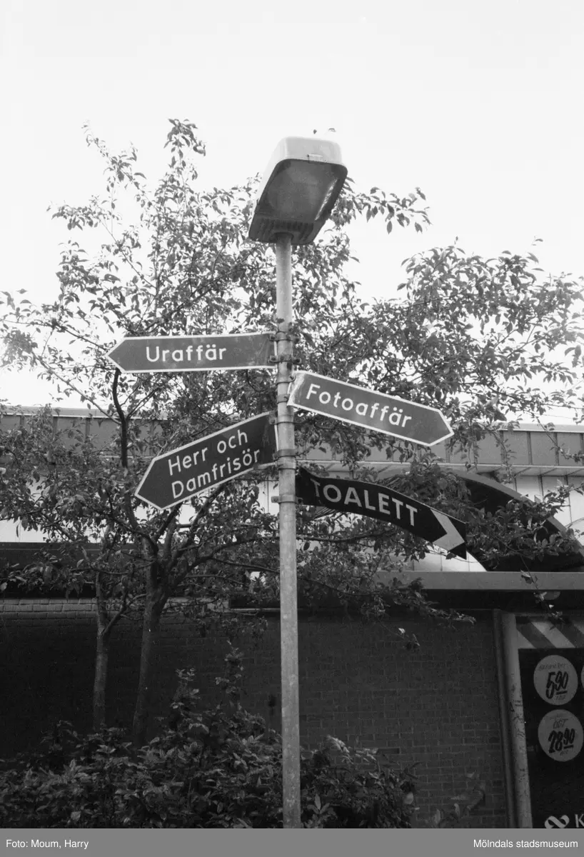Vandaliserade vägskyltar vid Almåsgången i Lindome centrum, år 1983. "De förstörda skyltarna vid Lindome centrum."