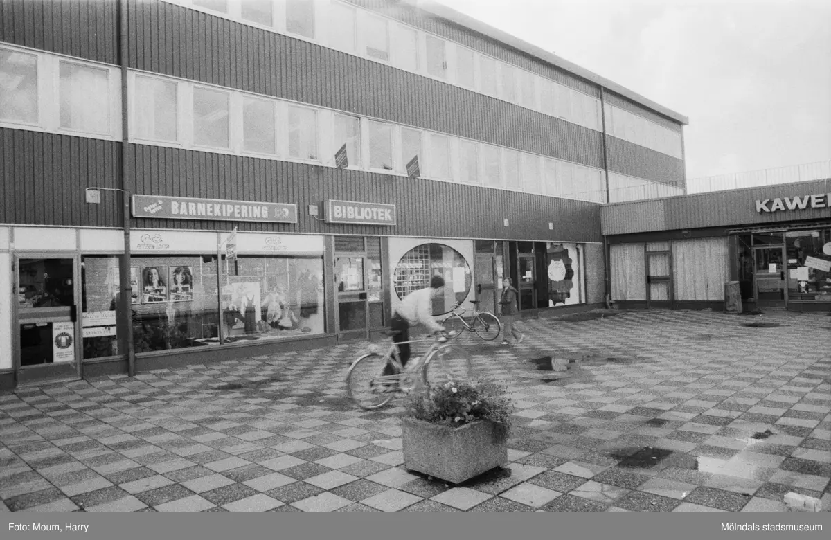 Hagabäcksleden 9 i Kållereds centrum, år 1984. Till vänster ses barnekiperingsaffären Peter & Lotta, Kållereds bibliotek samt kinakrogen Jasmin. Till höger ses konditoriet Kawerna (Hagabäcksleden 5) som delade byggnad med en bank som vette mot Gamla Riksvägen.