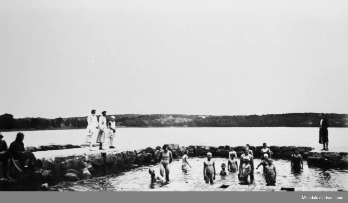 Personal och elever från Stretereds skolhem badar vid badbryggan i Tulebosjön.