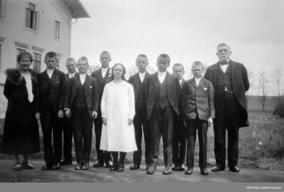 En grupp konfirmander. Håkan Jönsson som är förståndare på Stretereds skolhem finns med på bild. Platsen där bilden är tagen är okänd.