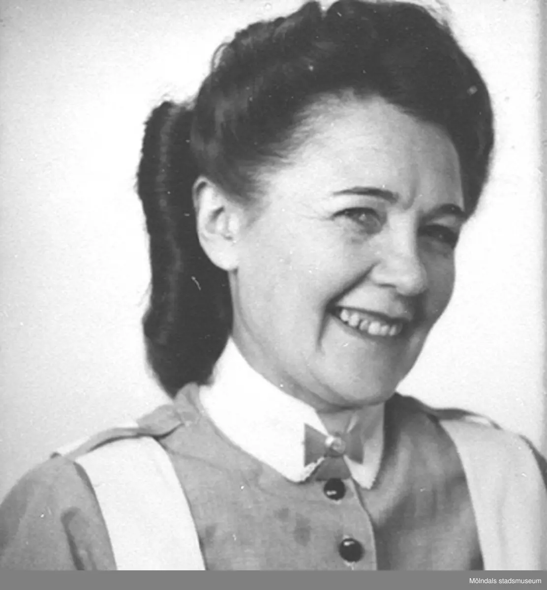 Del av fotokarta med 25 stycken porträttbilder av Karin Hasselberg (1903 - 1996) i yrkeskläder.