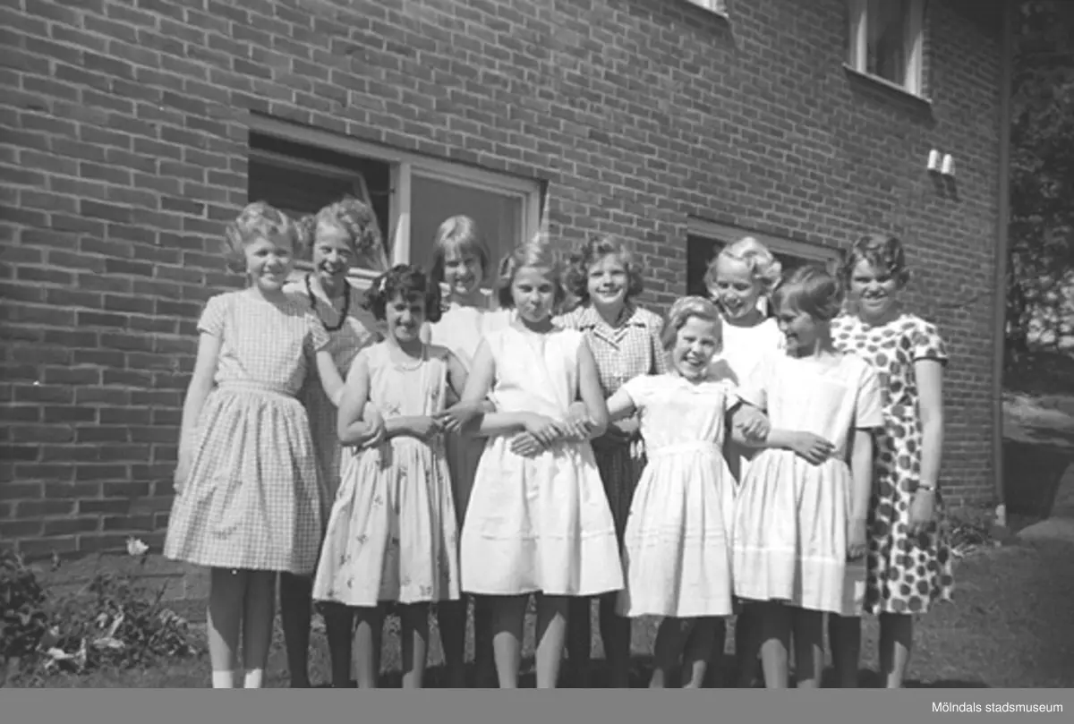 Unga kvinnliga elever står utomhus vid Skolhemmet Stretered. 1950-tal.