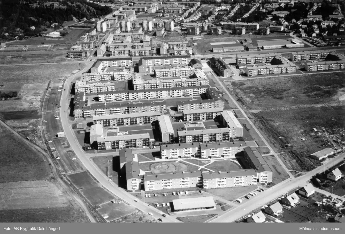 Flygfoto 1962 över Jungfruplatsen i förgrunden till höger och Bosgården i bakgrunden. Toltorpsgatan delar områdena. Längst ner i bildens mitt (svagt åt vänster) går Lammevallsgatan på bostadsområdets vänstra sida och på högra sidan går Jungfrustigen. Frejagatan, som här var öppen för bil- och busstrafik, går åt höger. I bakgrunden till vänster ses Safjället och Bifrostgatan.