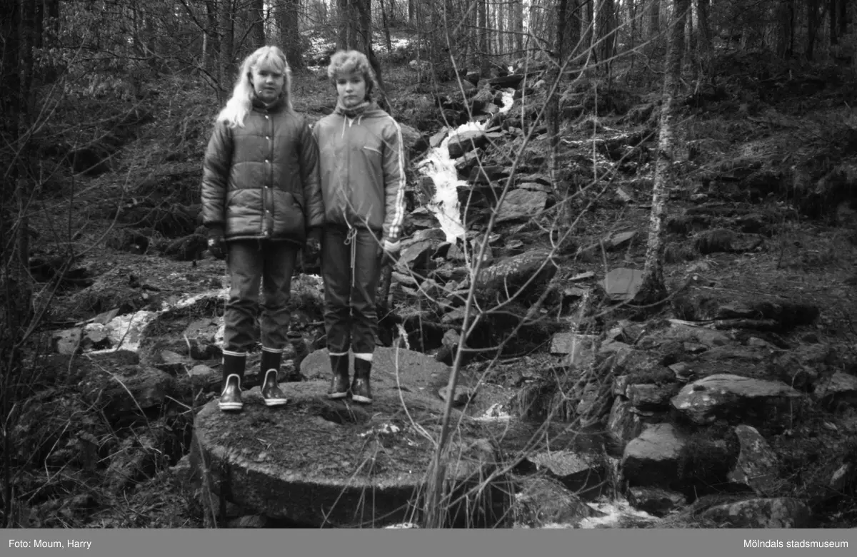 Två flickor vid två stora kvarnstenar i naturen i Bunketorp, Lindome, år 1983. "Så här pittoreskt ligger kvarnstenarna ute i skogen."