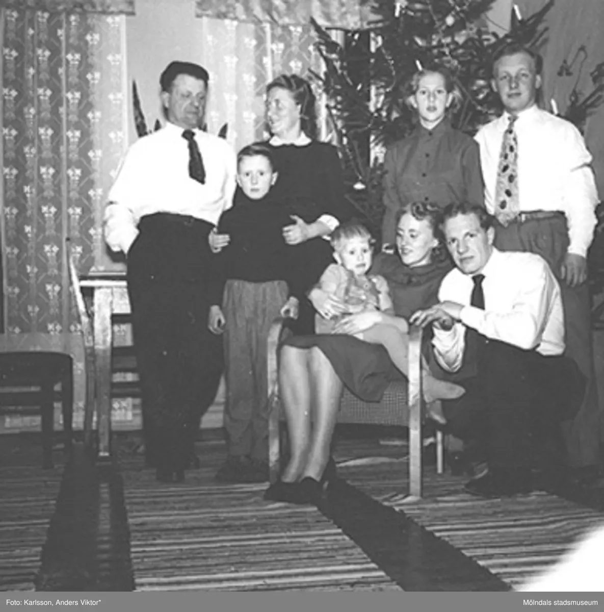 Juldagen 1953 hos mormor. Stående från vänster: Helmer och Astrid Garthman, med sonen Leif framför sig, Ingrid Karlsson samt okänd. Sittande i fåtöljen: Birgit Karlsson med (givaren) Alf Garthman i knät, hukande på knä: Rune Andersson,