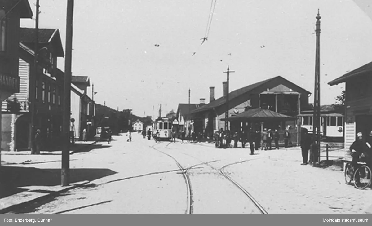 Spårvagnshallarna vid Mölndalsbro (i själva korsningen) och Pressbyråns kiosk i hörnet mellan Göteborgsvägen - Kvarnbygatan år 1929. Till vänster skymtar fasaderna på Kungsbackavägen 2, samt Göteborgsvägen 1, 3 och 5.