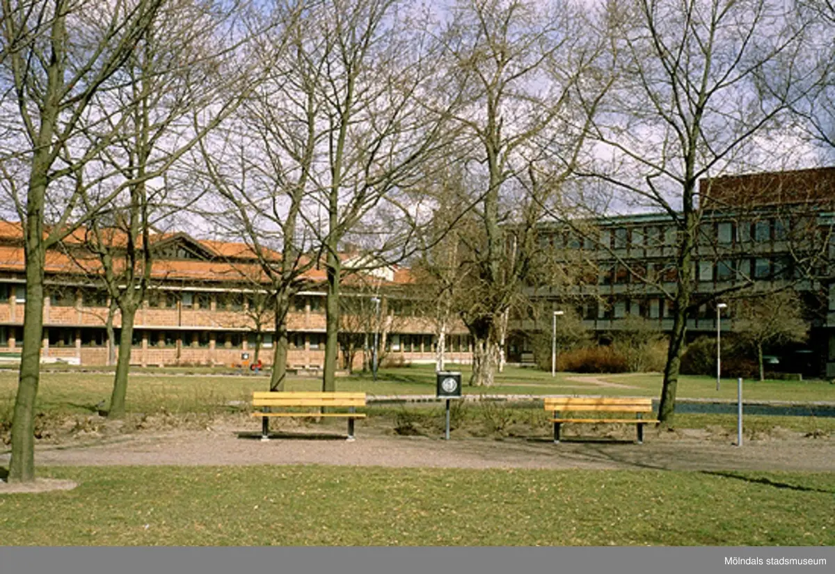 I förgrunden ser man ett par gula bänkar, en papperskorg och några träd som står i Stadshusparken. I bakgrunden ses Mölndals stadshus, mars 1993.