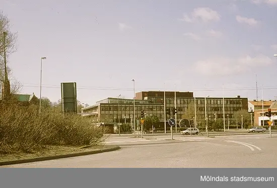 Rondellen mot Göteborgsvägen västerut, mars 1993. I fonden ses Stadshusplatsen och Mölndals stadshus. Relaterade motiv: 2003_0386 - 0387.