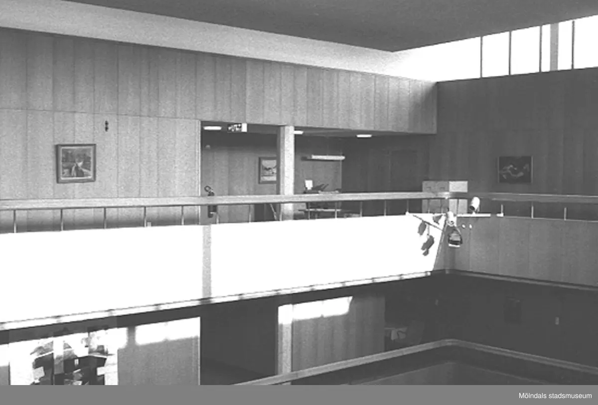 Stadshushallen med utsikt över loftgångar och våningar klädda med ekpanel. Mölndals stadshus, mars 1988.