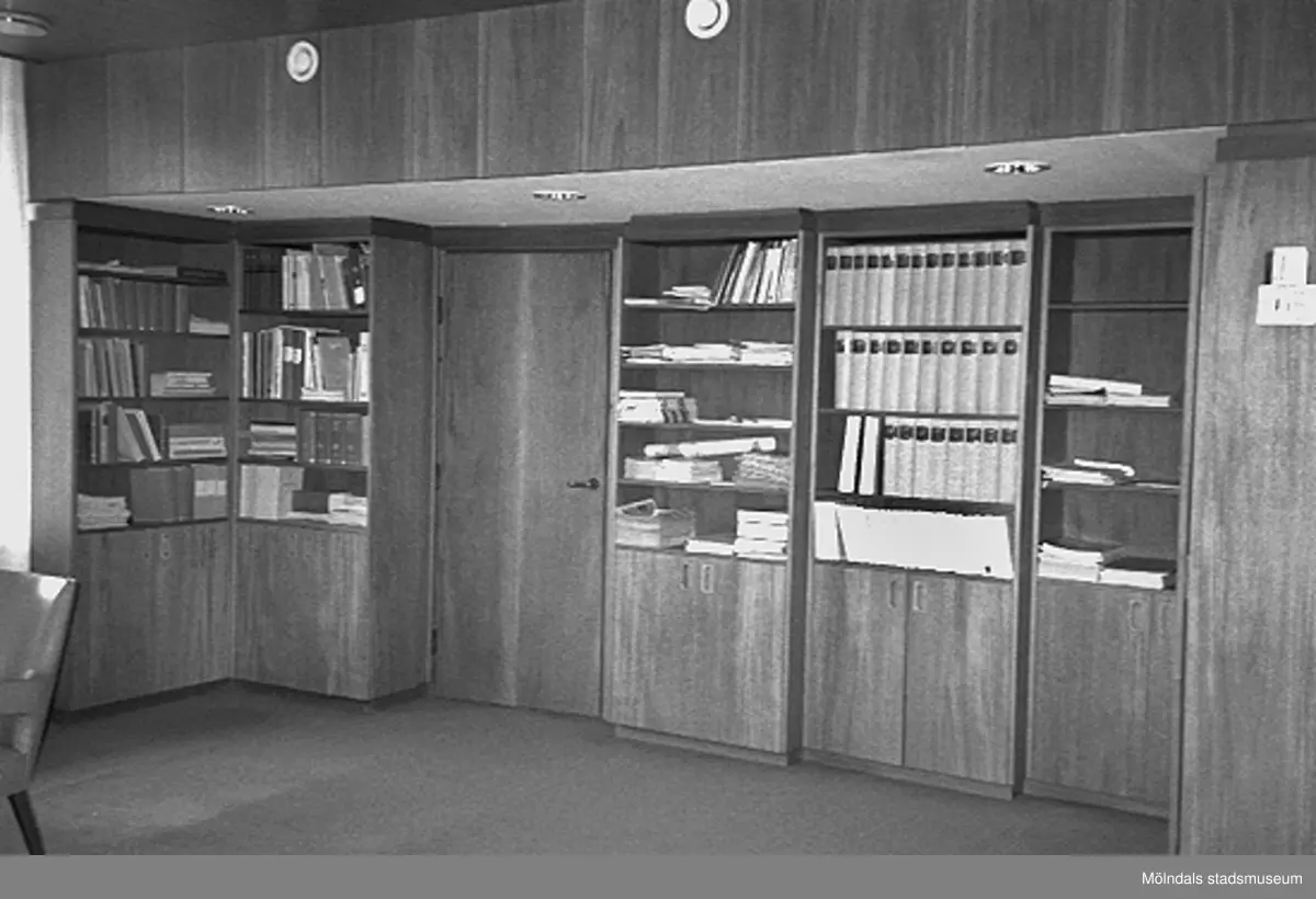 Mölndals stadshus, juni 1994. Inbyggda bokhyllor i ett rum.