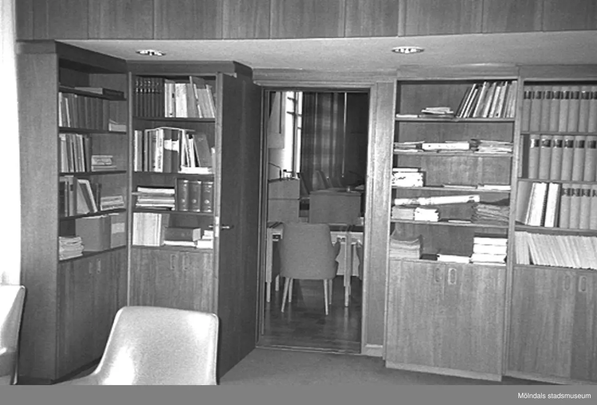 Mölndals stadshus, juni 1994. Inbyggda bokhyllor i ett rum.