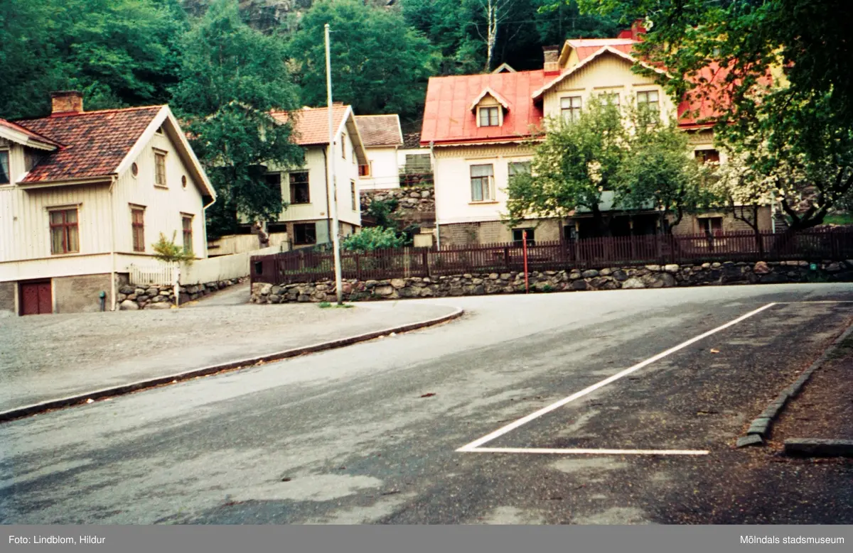 Bebyggelse vid Trädgårdsgatan, nuvarande Störtfjällsgatan, sedd från Alléen. Mölndal, 1970-tal. Till vänster ses Trädgårdsgatan 10. Vid fotograferingstillfället användes huset av Länkens Kamratförbund, senare klubblokal för Kvarnby basket. Till höger ses Trädgårdsgatan 8 som tidigare varit ett apotek.