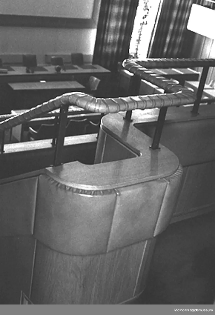 Mölndals stadshus, mars 1988. Närbild av balkongens ledstång i Stadsfullmäktiges sessionssal.