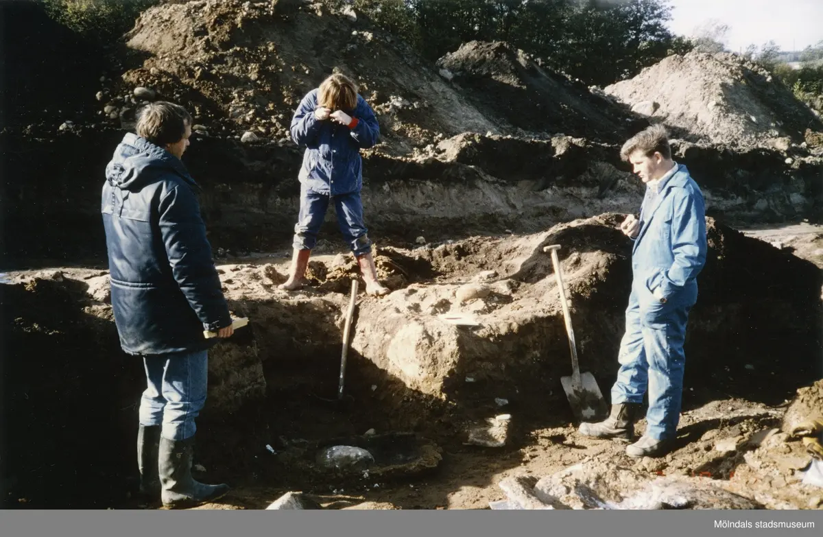 Arkeologisk utgrävning i Balltorp innan industribyggen. Från vänster: arkeolog Bengt Nordkvist, intendent Mari-Louise Olsson, tekniker Sven-Åke Svensson. År 1987.