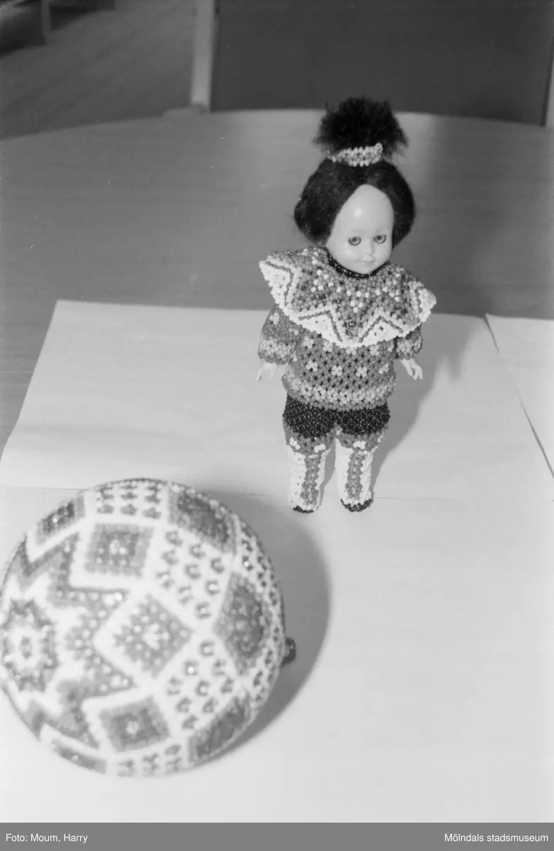 Utställning med pärlbroderier på Kållereds bibliotek, år 1985.