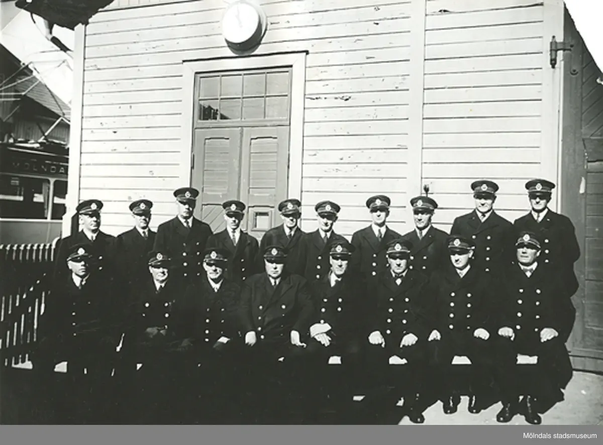 Grupporträtt på sista personalen på spårvagnshallarna i Mölndal,