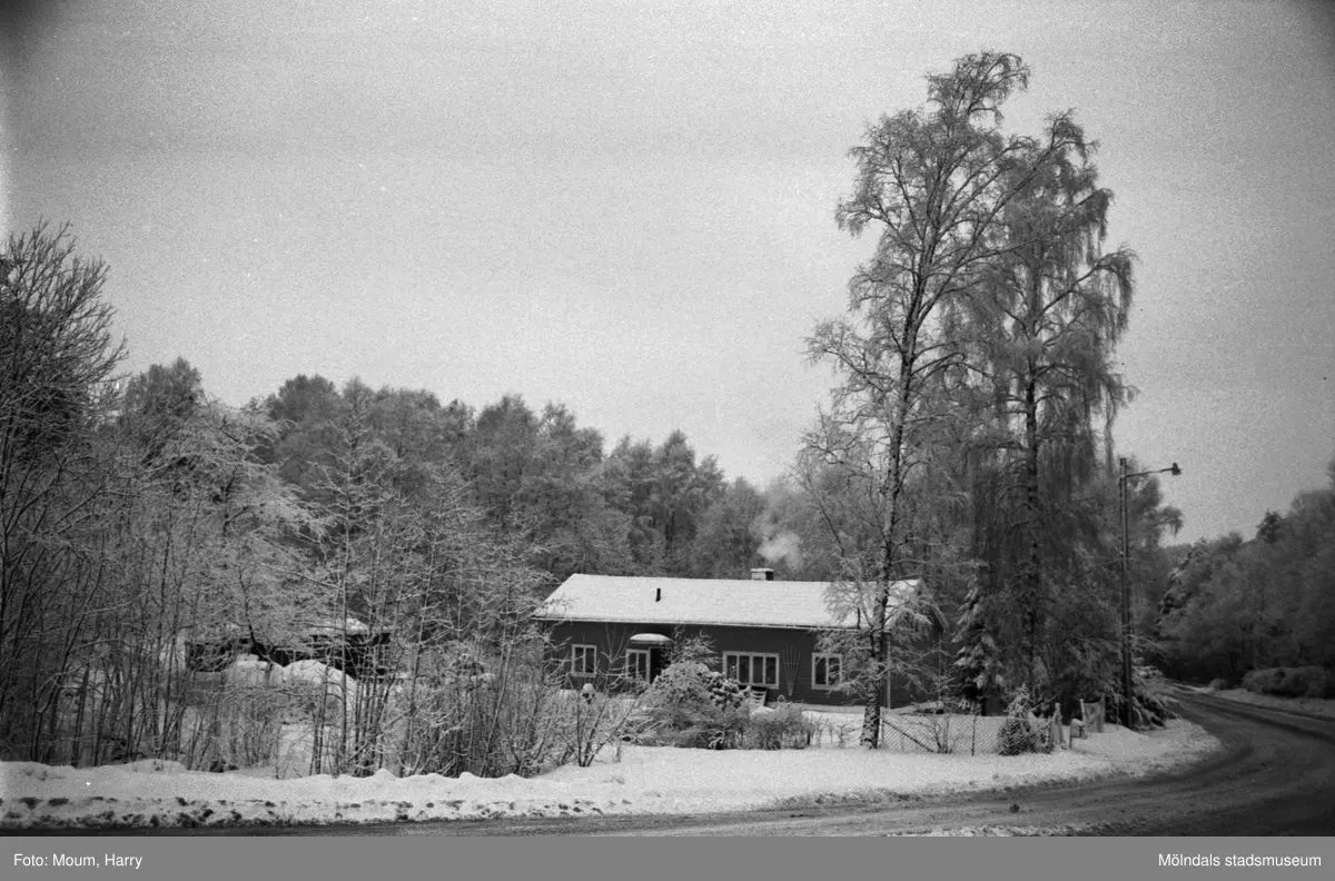 Vintervy i Kållered, år 1984. "Idyllen behöver inte vara långt borta från de stora stråken, en liten gul stuga vid Östra Lindomevägen där allt andas ro."