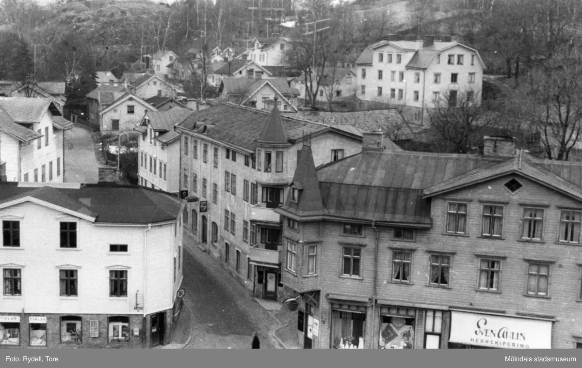 Vy från pappersbruket Papyrus fabriksområde i Forsåker, Mölndal, mot Trädgårdsgatans mynning i Kvarnbygatan på 1960-talet. I förgrunden ses Kvarnbygatan 23 och 25. Huset i mitten har adressen Trädgårdsgatan 4.